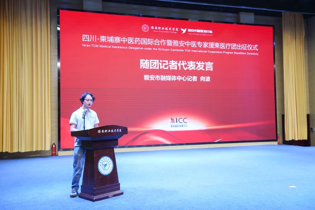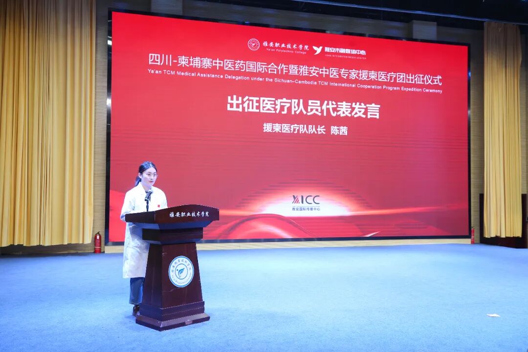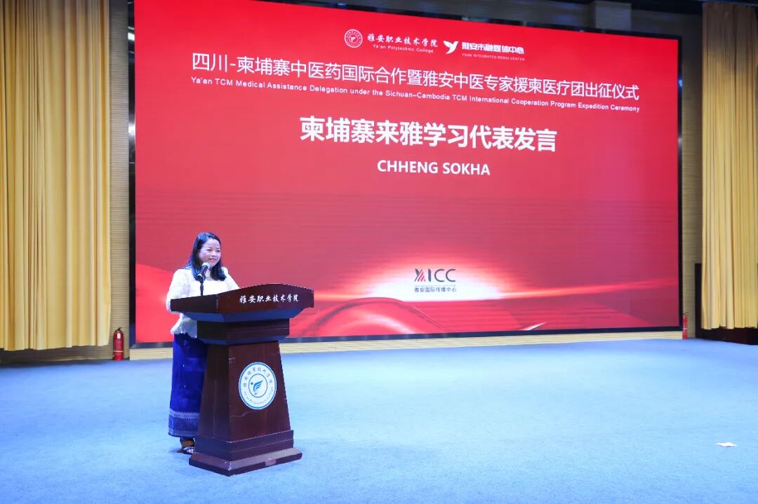 仪式上,来我校学习的柬埔寨学员代表CHHENG SOKHA分享了在雅安的学习收获与感悟。本次出征医疗队队长、我校中医与康复养生学院教师陈茜,以及随团记者代表向波分别发言,表达了不负重托、全力以赴完成任务的坚定决心。