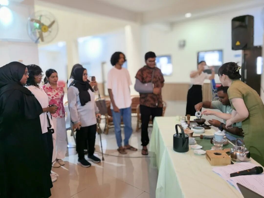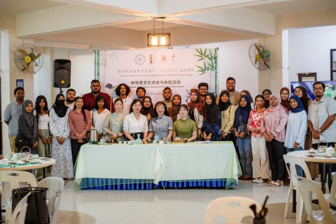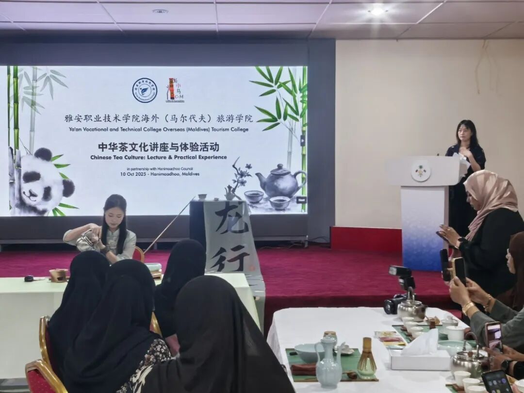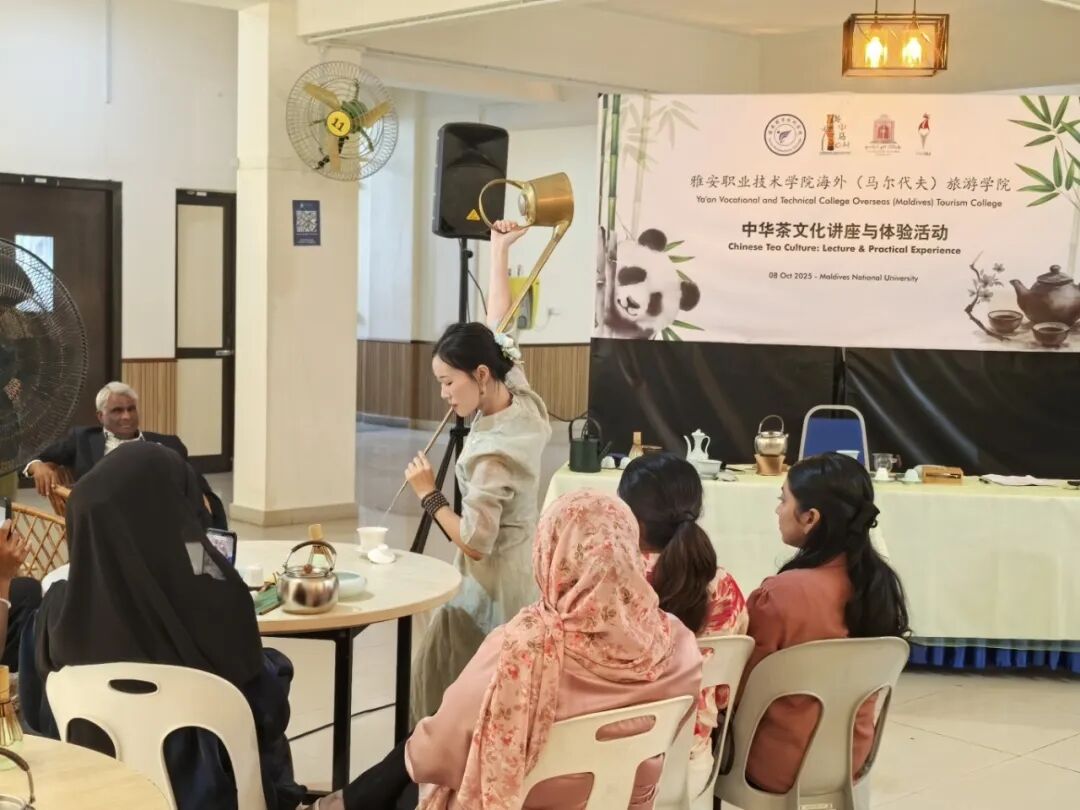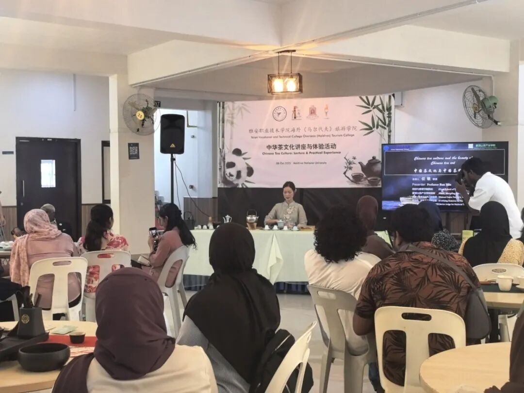 在马尔代夫国立大学,代表团与该校旅游管理学院质量主管阿米娜特・希亚玛等负责人,在学生实训基地就国际化旅游人才培养展开研讨。在国立大学学生活动中心,国家一级茶艺技师任敏教授为师生代表开展了《中国茶品鉴与茶艺鉴赏文化》主题讲座,系统介绍六大茶系与茶道内涵。学校学生李仪莹展示了中国盖碗茶技艺、长嘴壶“龙行十八式”,并现场开展中华茶文化培训与体验活动,激发了当地师生对中华茶文化的兴趣。